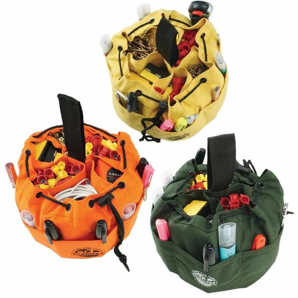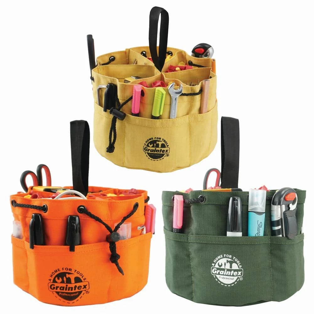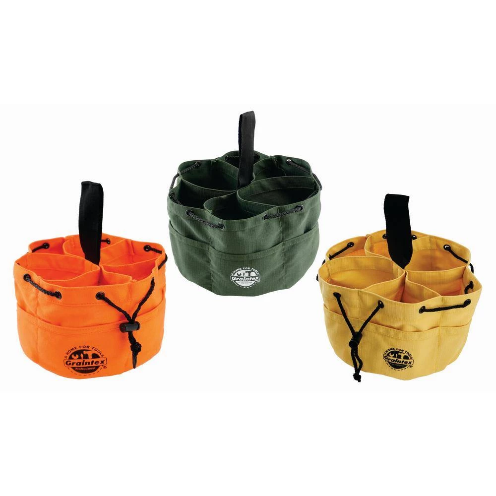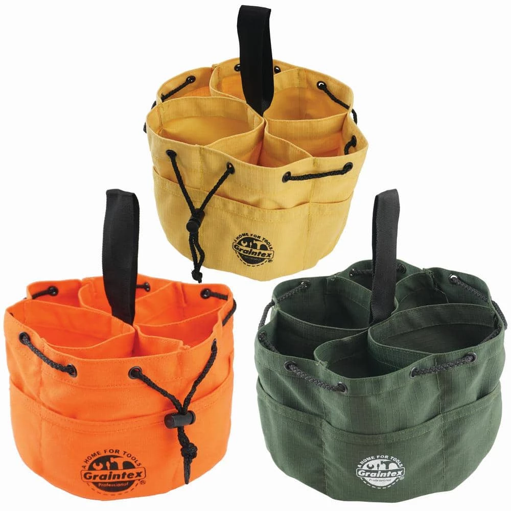 Graintex DISTINCTIVE PRODUCTS are handmade by our highly expert skilled craftsmen using high quality raw materials, giving our customer the satisfaction that will last much longer. Superior orange, yellow and dark green color rip-stop canvas has been used to prepare our exceptional line of grab bags. This exquisite grab bag consists of 6 large inner compartments and 12 medium sized outer pockets. The multipurpose pockets help in organizing small parts, small tools, various assortments of fasteners, nuts, bolts etc. The grab bag is easily accessible, it can be used in number of multiple other uses at the workplace or at home. With easily accessible pockets this grab bag is a handy product for daily use. Multiple Grab Bags can be stored in a 5 Gal. bucket, it helps in securing lot of small parts in a small place. The grab bag comes with drawstring closure with spring loaded easy release lock. This lightweight grab bag can be used for multiple projects such as carpentry, housework, gardening, garage projects, electricians, construction, etc. This tool pouch is professional stitched and reinforced with steel rivets for extra-durability.