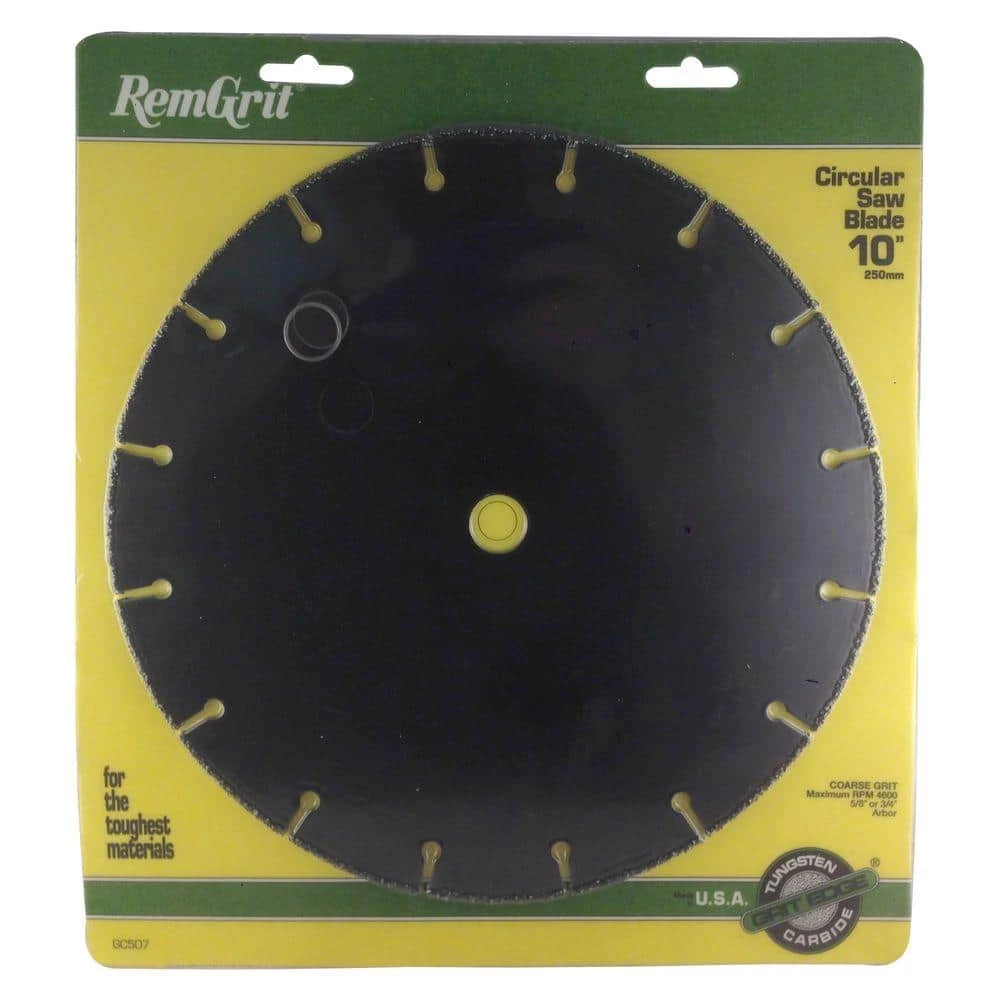 RemGrit Carbide Grit Circular Saw Blades cut extremely hard abrasive materials. The cutting edge of tungsten carbide particles bonded to alloy steel back. The blade has high heat and abrasion resistance; no teeth to dull or chip; resists snagging; smooth cutting; greater wear resistance.