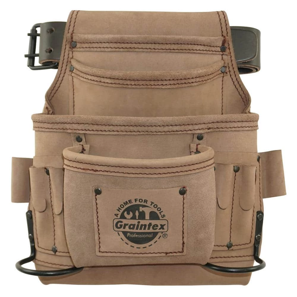 Graintex DISTINCTIVE PRODUCTS are handmade by our highly expert skilled craftsmen using top quality beige genuine top tanned leather, giving our customer the satisfaction with our product that can last much longer. The 10 Pocket Nail and Tool Pouch with 2 in. Leather Belt is constructed with heavy-duty genuine top grain leather that is extra soft and durable. Using the superior leather hides to prepare our exceptional line of top grain series. This specific series is treated with the top-notch quality of chemicals and oils for extra durability and strength. This exquisite tool pouch consists of ten pockets for extra convenience, the tool pouch comes with a 3 in. W tunnel slots. Designed with 2 steel hammer holders following with 1 large pocket that can hold multiple tools. 1 medium front pocket that can fit nails, medium-sized tools, 2 belt level inner pockets, and 6 small pockets for screwdrivers, pens, pencils, utility knife, and other miniature sets. The pockets are easily accessible, this tool pouch can be used in number of multiple other uses at the workplace or at home. With easily accessible pockets this tool pouch is a handy product for daily use.