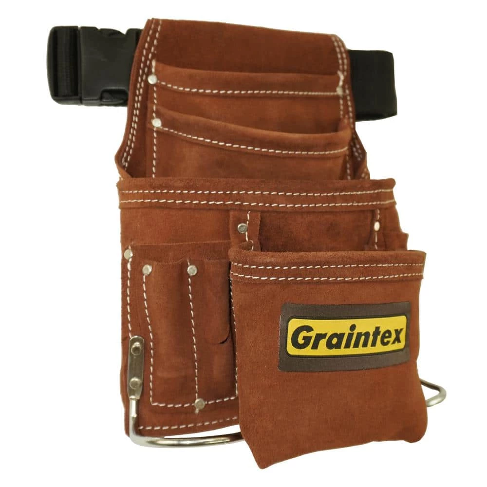 Graintex DISTINCTIVE PRODUCTS are handmade by our highly expert skilled craftsmen using heavy-duty genuine Suede Leather, giving our customer the satisfaction with our product that can last much longer. All Graintex products are handmade using the finest materials for durable and long-lasting usage. Using the superior Suede Leather hides to prepare our exceptional line of Nail and Tool Pouches. This specific series is treated with the top-notch quality of chemicals and oils for extra durability and strength. All our products are comprised with black plated hardware and heavily double stitched at every stress point with reinforced rivets to provide extra-longevity. This remarkable piece consists of 10 pockets for extra convenience while on the field and carries a belt tunnel slot that can fit up to 2. 3/4 in. W belt with a 2 in. webbing belt with quick release PVC buckle fitting waist sized up to 50 in. All Graintex products are uniquely originated with heavy-duty materials for a sturdy finish for an easier accessibility, extra-longevity, and a finer preference. Graintex products are designed and manufactured by highly professional experienced skilled craftsmen. Graintex is a family owned company founded in 2005 and has a manufacturing unit in India. Graintex products are professionally designed for use by professionals worldwide.