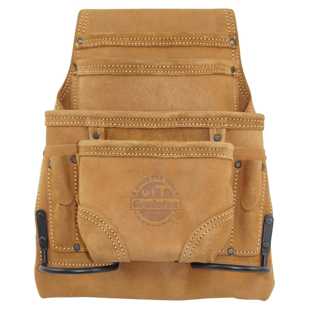 Graintex Inc. is proud to introduce a 10-Pocket Nail and Tool Pouch framed with Oil Tanned leather. Its designed for easy accessibility, extra-durability and handy expandability. Contains 1 large, 1 medium, 6 small pockets for small to hand tools, 2 belt level inner pockets and 2 metal hammer holders fitting all standard sized hammers. Double stitched at all stress points reinforced with rivets and black plated hardware. Carries a belt tunnel slot that can fit a 2-3/4 in. W belt.