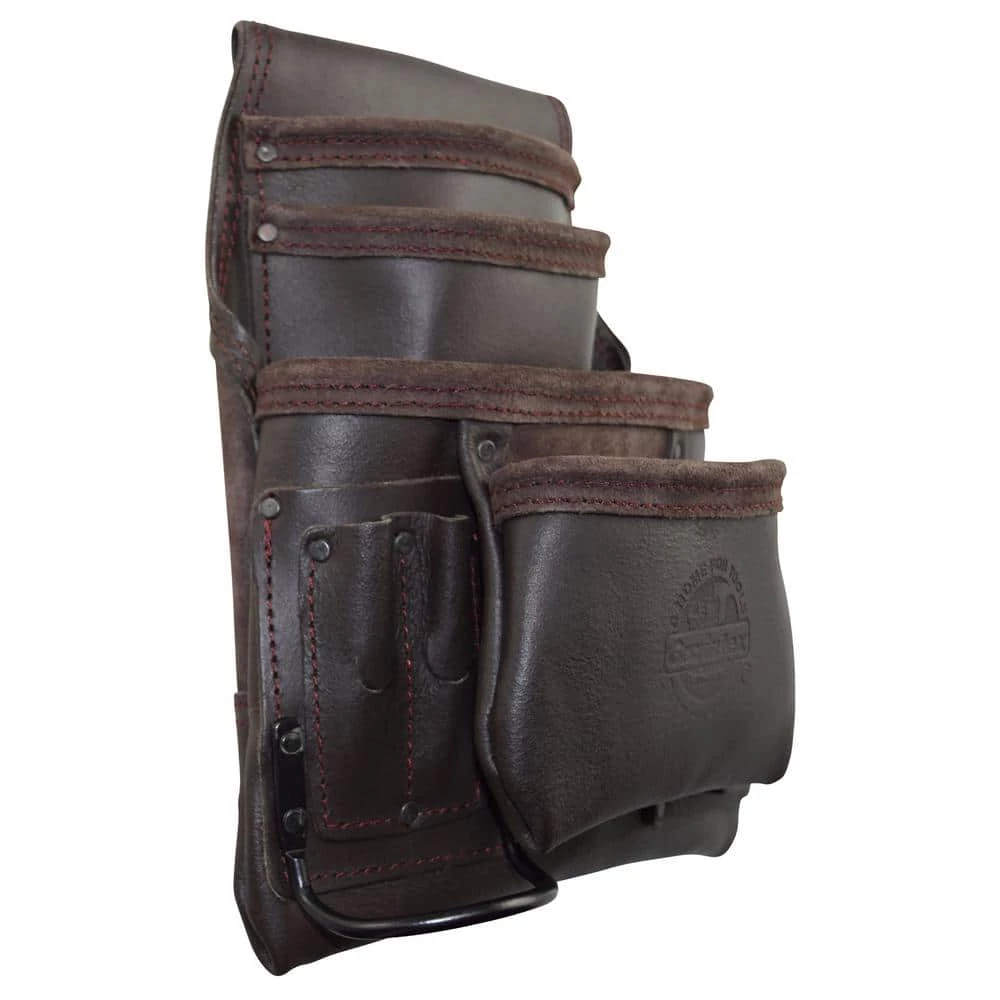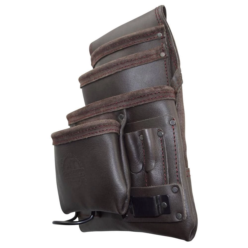 Graintex Inc. is proud to introduce a 10-Pocket Nail and Tool Pouch framed from heavy-duty Oil Tanned leather. Its designed for easy accessibility, extra-durability and handy expandability. Contains 1 large, 1 medium front pocket, 2 belt level inner pockets, 6 small tools pockets, 1 measuring tape holder and 1 metal hammer holders fitting all standard sized hammers. Double stitched at all stress points reinforced with rivets and black plated hardware. Carries a belt tunnel slot that can fit a 2-3/4 in. W belt.
