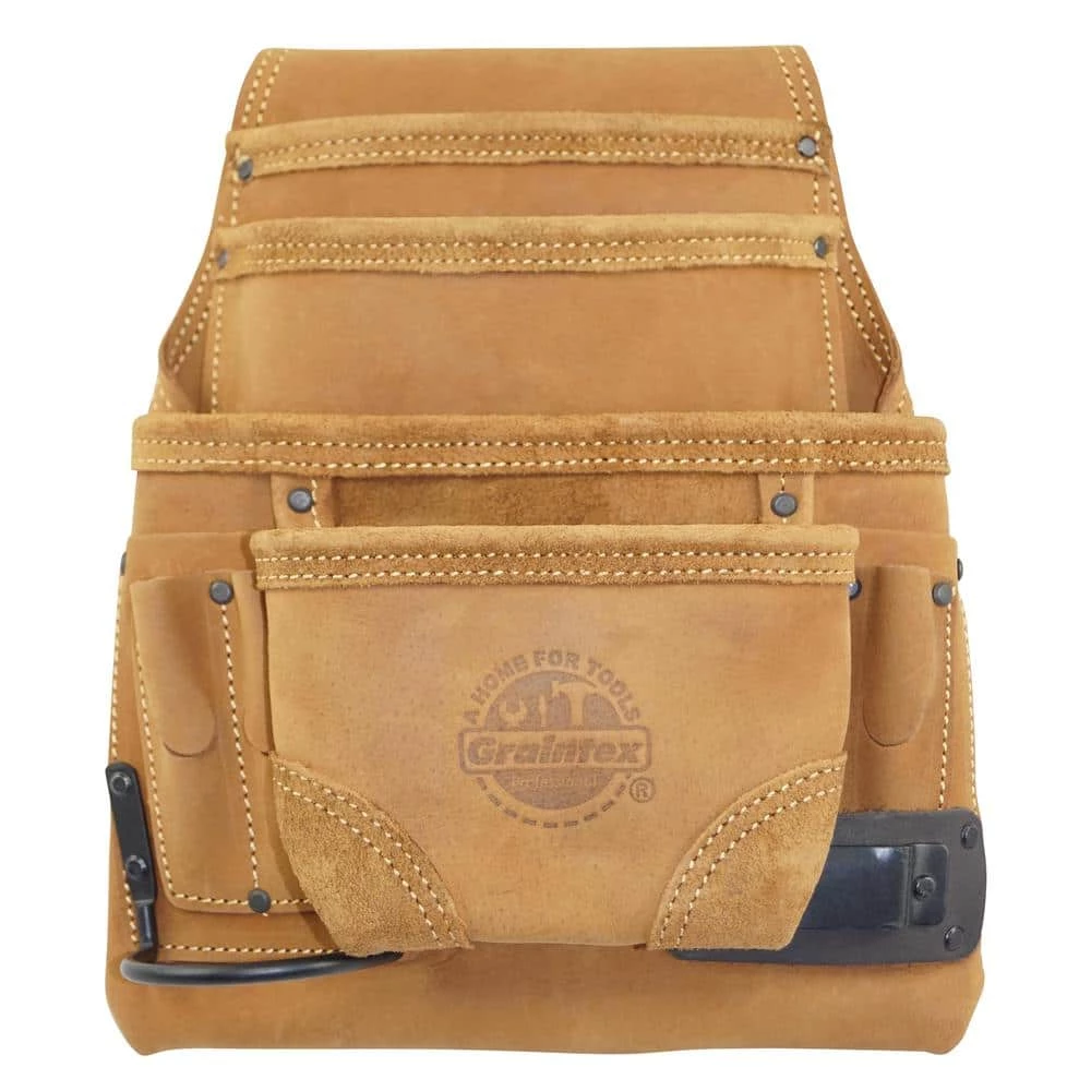 Graintex Inc. is proud to introduce a 10-Pocket Nail and Tool Pouch framed with Oil Tanned leather. Its designed for easy accessibility, extra-durability and handy expandability. Contains 1 large, 1 medium, 6 small pockets for small to hand tools, 2 belt level inner pockets, 1 hammer holder fitting all standard sized hammers and 1 measuring tape holder clip fits all standard measuring tapes. Double stitched at all stress points reinforced with rivets and black plated hardware. Carries a belt tunnel slot that can fit a 2-3/4 in. W belt.