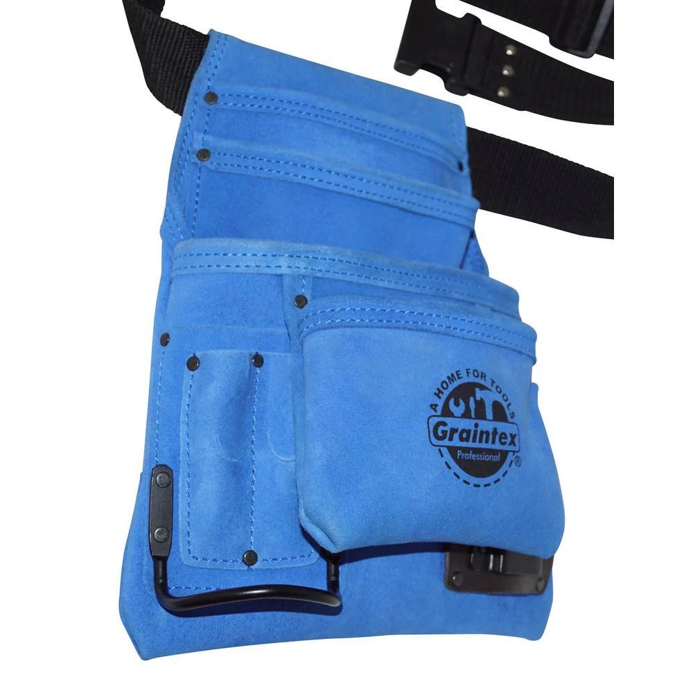 Graintex Inc. is proud to introduce tool pouches with belts. Its designed for an ease while working on hands-on projects, to help store hand tools, nails, screws and other construction accessories. Crafted in heavy-duty fine suede leather with double stitched at all stress points that heavily reinforced with rivets, black plated hardware for durability. And a web belt with PVC quick release buckle. Lightweight material, comes in different colors and quality you can trust. Warranty only against manufacturer defects.