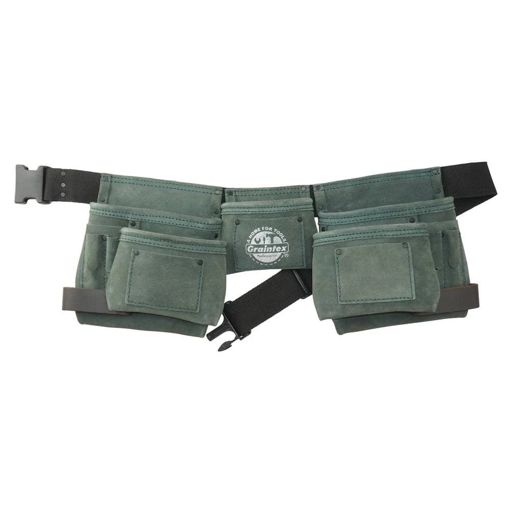 Graintex distinctive Products are handmade by our highly expert skilled craftsmen using top quality suede leather, giving our customer the satisfaction with our product that can last much longer. The Eleven Pocket Hunter Green Tool Apron constructed with suede leather that is extra soft and durable. This specific series is treated with the top-notch quality of chemicals and oils for extra durability and strength This exquisite tool apron consists of eleven pockets for extra convenience. Designed with a 2 in. webbing belt, following with 2 large pocket that can hold multiple tools, 3 medium pocket that can fit nails, medium-sized tools and 6 small pockets for screwdrivers, pens, pencils, utility knife and other miniature sets. The pockets are easily accessible, this tool apron can be used in number of multiple other uses at the workplace or at home. with easily accessible pockets this tool pouch is a handy product for daily use. Accessories include 2 in. webbing belt with a PVC quick release that can fit waist from 28 in. to 50 in. and 2 leather hammer loops which can fit all standard sized hammers. This tool apron can be used for multiple projects such as carpentry, housework, gardening, garage projects, electricians, construction, etc. This apron is double stitched and reinforced with steel rivets for extra durability.