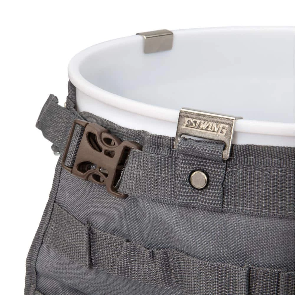Designed and constructed for maximum utility and ultimate reliability, this Estwing 28-compartment bucket organizer helps carry the tools you need to get work done. This bag is made with rugged 1800D polyester fabric that can hold up to long, hard use on the most demanding job sites. Lining the outside of the organizer are 11 tool loops, 16 open top pockets, and a rivet secured steel tape measure clip for quick and convenient tool access. Additionally, a large zipper secured pocket provides a convenient place to store small, easily lost parts, tools, or even a coiled up short extension cord. To keep the organizer securely held onto a standard sized 5-gallon bucket it features 4 heavy-duty steel hangers and a durable ABS plastic buckle secured strap that holds tight around the outer lip of the bucket. With a fully unobstructed interior, the bucket is able to still be used to hold large power tools, parts, or be simply used to store oily or dirty items or even just to hold wet cleaning rags.