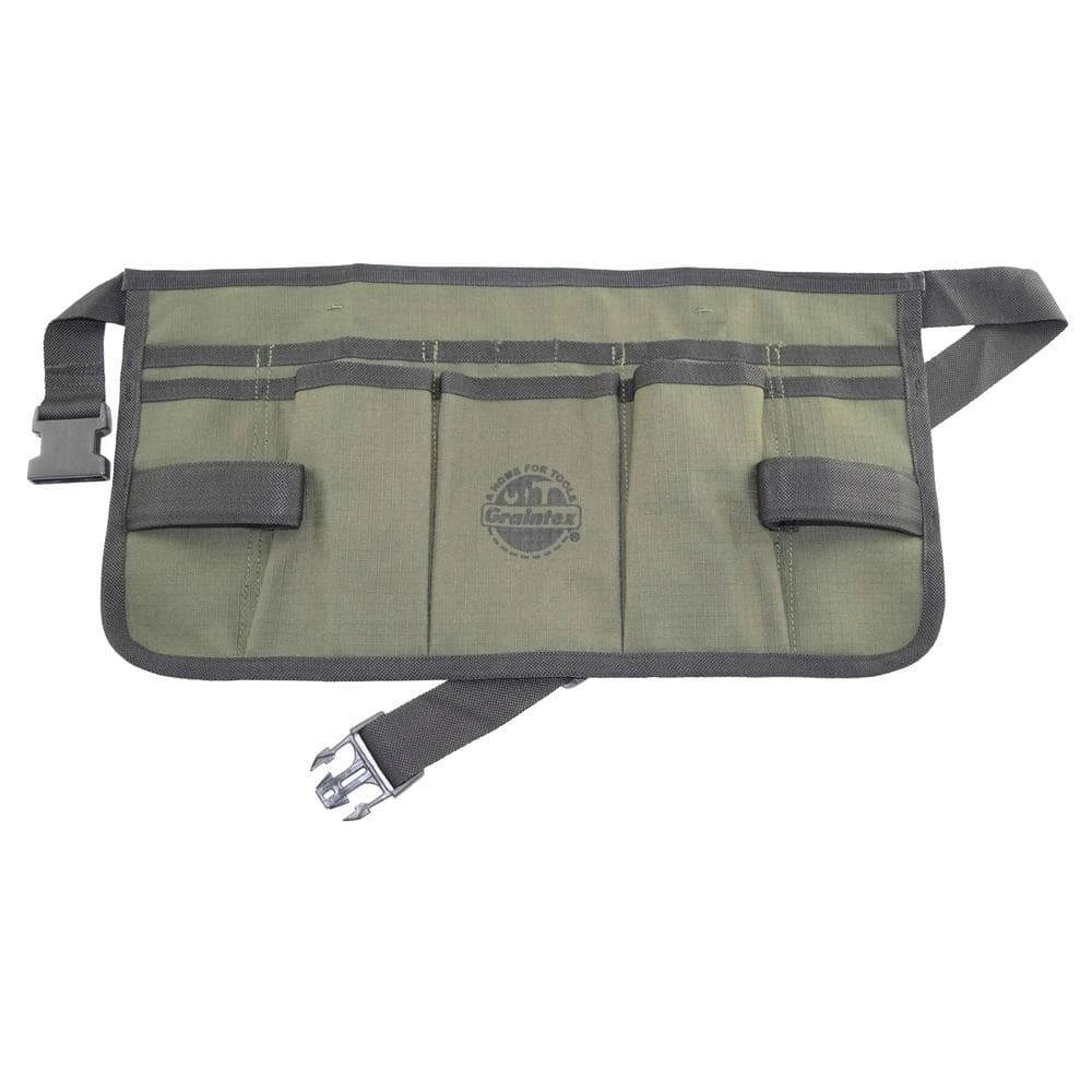 Graintex Inc. is proud to introduce a 12 Pocket Waist Apron framed from heavy-duty Ripstop canvas. Its designed for easy accessibility, extra durability, and handy expandability. Contains 9 large, 3 small pockets, and 2 webbing hammer loops fitting all standard sized hammers. Double stitched at all stress points. Carries a 1.1/2 in. web belt with quick release buckle.