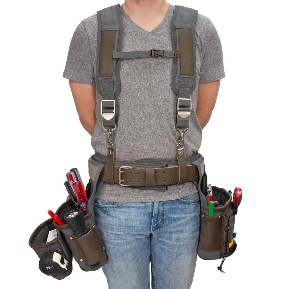 Designed for maximum utility and constructed for ultimate reliability this Estwing electrician’s tool rig has multiple large, open pockets to let you carry the tools you need to get your work done. Made from a combination of rugged 1800D polyester and top grain leather, this rig supplies you with a total of 13 large and small pockets to store a variety of screws, nails, tools and more. Additional storage includes several tool loops to store screw and bit drivers, an adjustable flashlight loop, a steel electrical tape chain, a steel hammer holder, a tape measure clip and a large, wet-molded leather tool loop. Rivet-reinforced stress points provide additional support to the heavy-duty bar-tack stitching and to help when supporting heavy loads the rig includes removable 5-point padded suspenders. The leather belt has a steel, double-tongue roller buckle and slides through a wide padded liner made with cooling mesh to provide day long comfort and fit on waist sizes of 30 in. to 52 in.