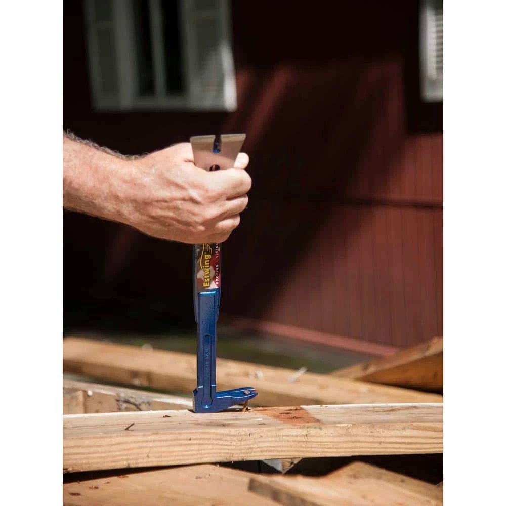This bar is truly a unique patented contractor bar. This Estwing 17 in. roofing, siding, contractor bar is drop forged from fine tool steel. One end has a thin blade with a 2-1/2 in. fulcrum giving it a higher lift than other bars. This 3 in 1 bar is perfect for removing shingles, sheeting and siding along with downspouts and gutters. The other end has a Japanese pattern nail puller with rounded head to improve leverage. It also removes imbedded nails with ease. Protect your eyes from flying particles and dust. Always wear safety goggles. Bystanders shall also wear safety goggles.