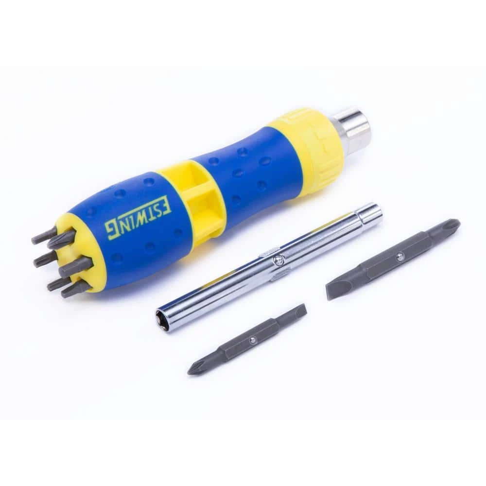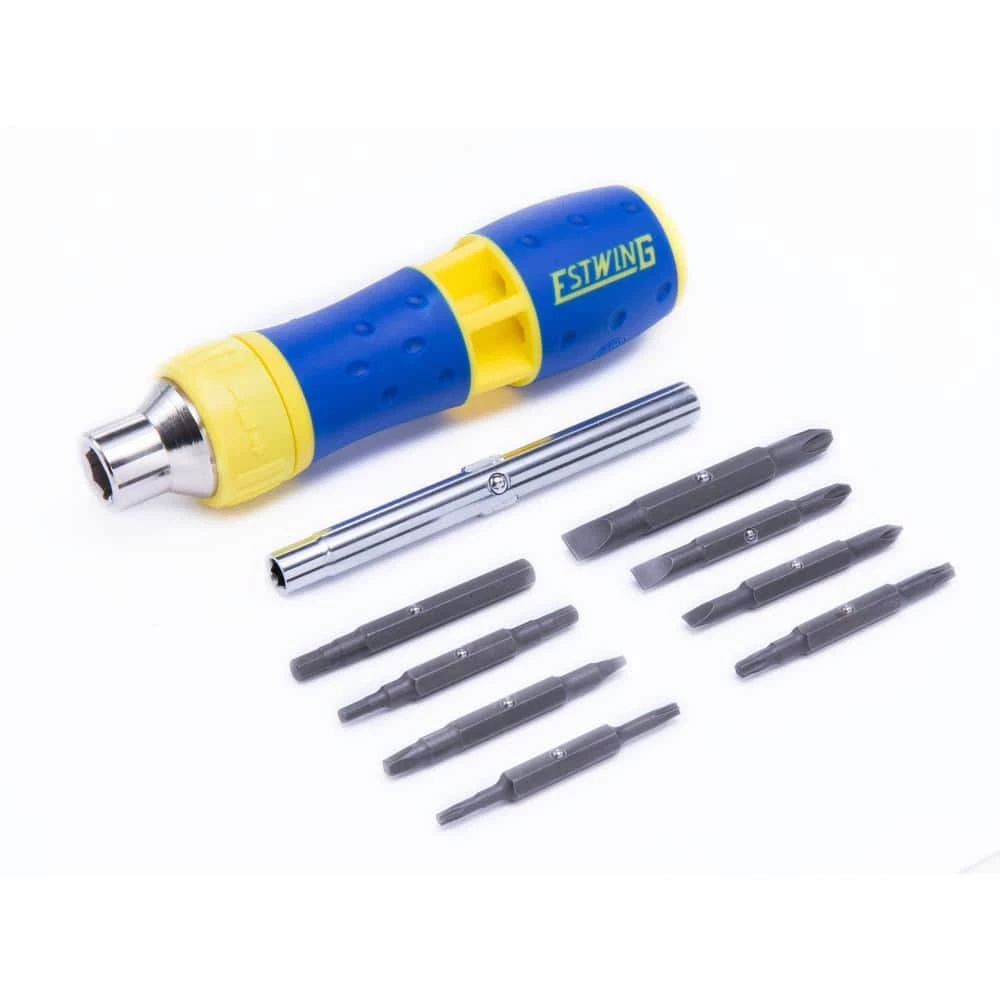 Carry an entire tool box worth of screw and nut drivers in a single tool with this handy ratcheting screwdriver set from Estwing. Perfect for those handyman and repair jobs that require more than one type of driver size, this useful multitool has 8 double-ended bits in the most commonly found driver sizes in Phillips, slotted/flat blade, hex, Torx/star and square tip styles. The bit driver handle itself has a lockable ratcheting mechanism built in that can function in forward, reverse or be locked in place for high-torque and traditional screwdriver use. The flip shaft and handle also are sized to be used as 6-point nut drivers/sockets for added versatility with sizes 1/4 in., 5/16 in. and 7/16 in. The handle also has on board storage for the 6 bits not held in the flip shaft with easy slide out access. Set includes the following double ended bit drivers: PH1 x SL3/16 in., PH2 x SL1/4 in., PH3 x SL5/16 in., H1/8 in. x H5/32 in., H3/16 in. x H1/4 in., T10 x T15, T20 x T25 and SQ1 x SQ2.