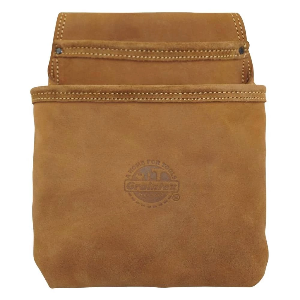 Graintex Inc. is proud to introduce a 2-Pocket Nail and Tool Pouch framed with Oil Tanned leather. Its designed for easy accessibility, extra-durability and handy expandability. Contains 1 large and 1 belt level inner pocket. Double stitched at all stress points reinforced with rivets and black plated hardware. Carries a belt tunnel slot that can fit a 2-3/4 in. W belt.