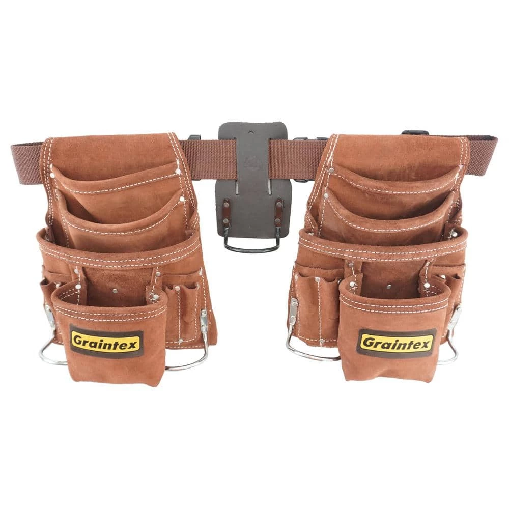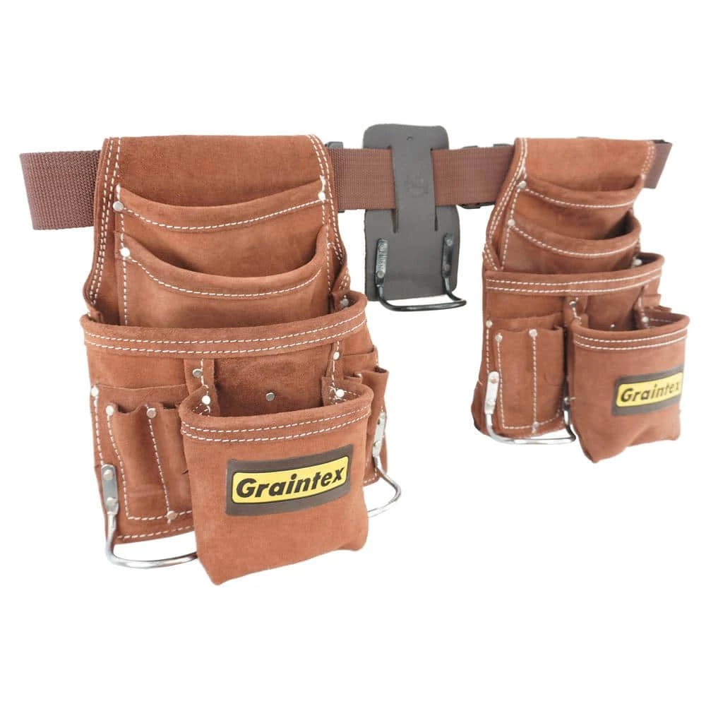 - Multiple pockets: Graintex 20 pocket nail and tool pouch set in brown color suede leather has 20 multiple pockets, 2 large size main pocket for larger tools, 4 belt level inner pocket for smaller tools, measuring tapes etc., 2 medium size front pocket for nails, smaller tools etc., 12 small pockets for smaller tools, screwdrivers, bits, pens, pencils etc., the pockets are easily accessible, this tool pouch can be used in number of multiple other uses at the workplace or at home, with easily accessible pockets this tool pouch is a handy product for daily use