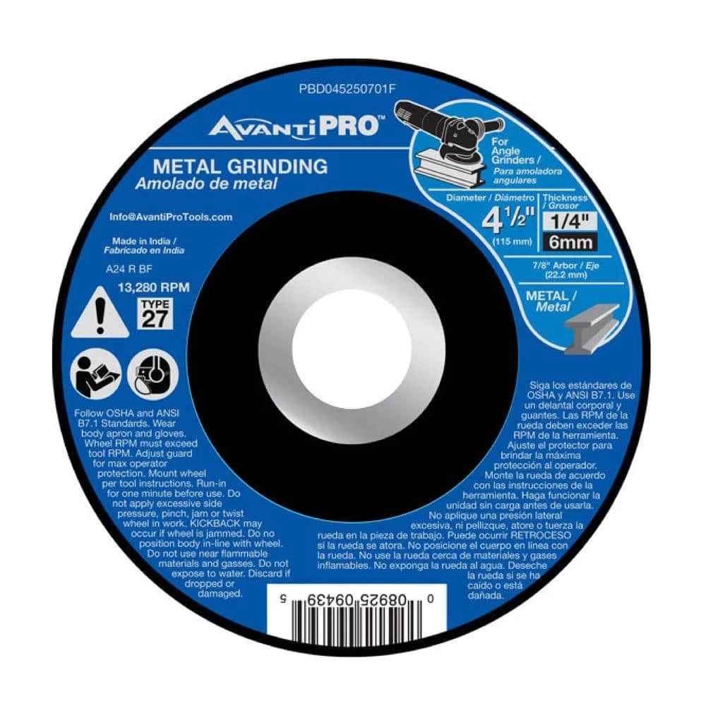 Avanti Pro metal grinding wheels are made for smoothing welds, beveling pipe, and general purpose stock removal of metal. They provide high performance and durability to complete your metal project. For use when cutting metal with a right angle grinder.