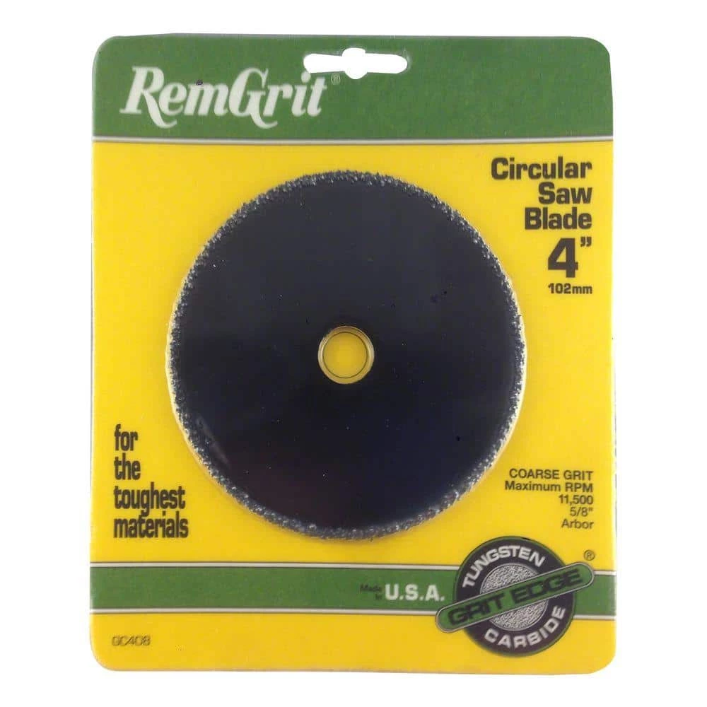 RemGrit Carbide Grit Circular Saw Blades cut extremely hard abrasive materials. The cutting edge of tungsten carbide particles bonded to alloy steel back. The blade has high heat and abrasion resistance; no teeth to dull or chip; resists snagging; smooth cutting; greater wear resistance.