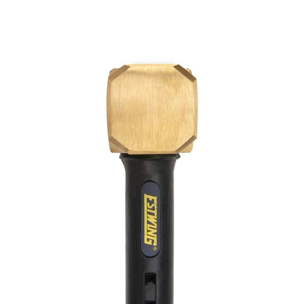 Tackle metalworking, automotive, mining, or industrial projects with the hard-hitting power of this Estwing brass sledge hammer. Designed and built for heavy-duty use, this hammer features a 4 lbs. forged head that is made from drop forged brass. The resulting softer head will mushroom when striking harder materials like iron and steel, preventing damage to struck objects with finished surfaces that would be easily damaged by a hardened steel hammer. Because the head is made of soft brass, it resists sparking during use making it ideal for use in mining, natural gas and oil drilling and refining, and any area where tools that might cause sparks during use cannot be used. This head is mounted to a 12 in. L, indestructible handle that consists of an ergonomic shock-absorbing vulcanized rubber handle overlay that hides 6 spring steel bars that run its full length providing exceptional overstrike protection in addition to additional impact force. Steel locking plates and a specialized bonding process secure the head to the handle and ensure that it never loosens. For added confidence and convenience when working and for storage the handle also has a steel reinforced lanyard hole at the base to allow for a wrist strap or hanging loop to be attached without fear that it will tear free over time from wear.