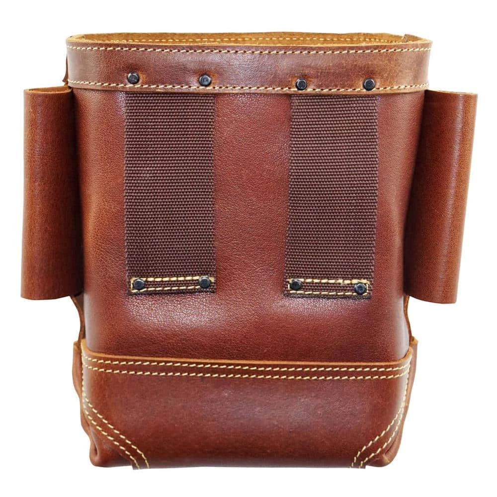 Graintex Inc. is proud to introduce Nut and Bolt Bag designed with Ambassador Series Top Grain leather. This product consists of 1 large pocket for nuts and bolts, a bull pin holder on both sides, and a belt slot tunnel that fits at an estimate of 3 wide belt. This item can make work much more effective and efficient because 1 can hang this around their waist and not get distracted while constantly losing track of nuts and bolts. Made with heavy-duty genuine top grain leather and double stitched at all stress points reinforced with rivets.