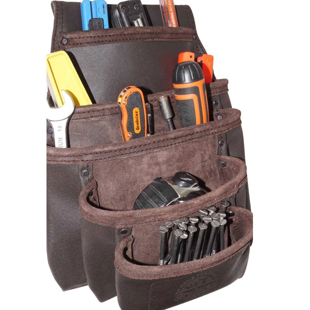 - Multiple pockets: Graintex 5-pocket nail and tool pouch in oil tanned leather have 5 multiple pockets, 2 large size main pockets for larger tools, 1 belt level inner pocket for smaller tools, measuring tapes etc., 2 medium size front pocket for nails, smaller tools etc., the pockets are easily accessible, this tool pouch can be used in number of multiple other uses at the workplace or at home, with easily accessible pockets this tool pouch is a handy product for daily use
