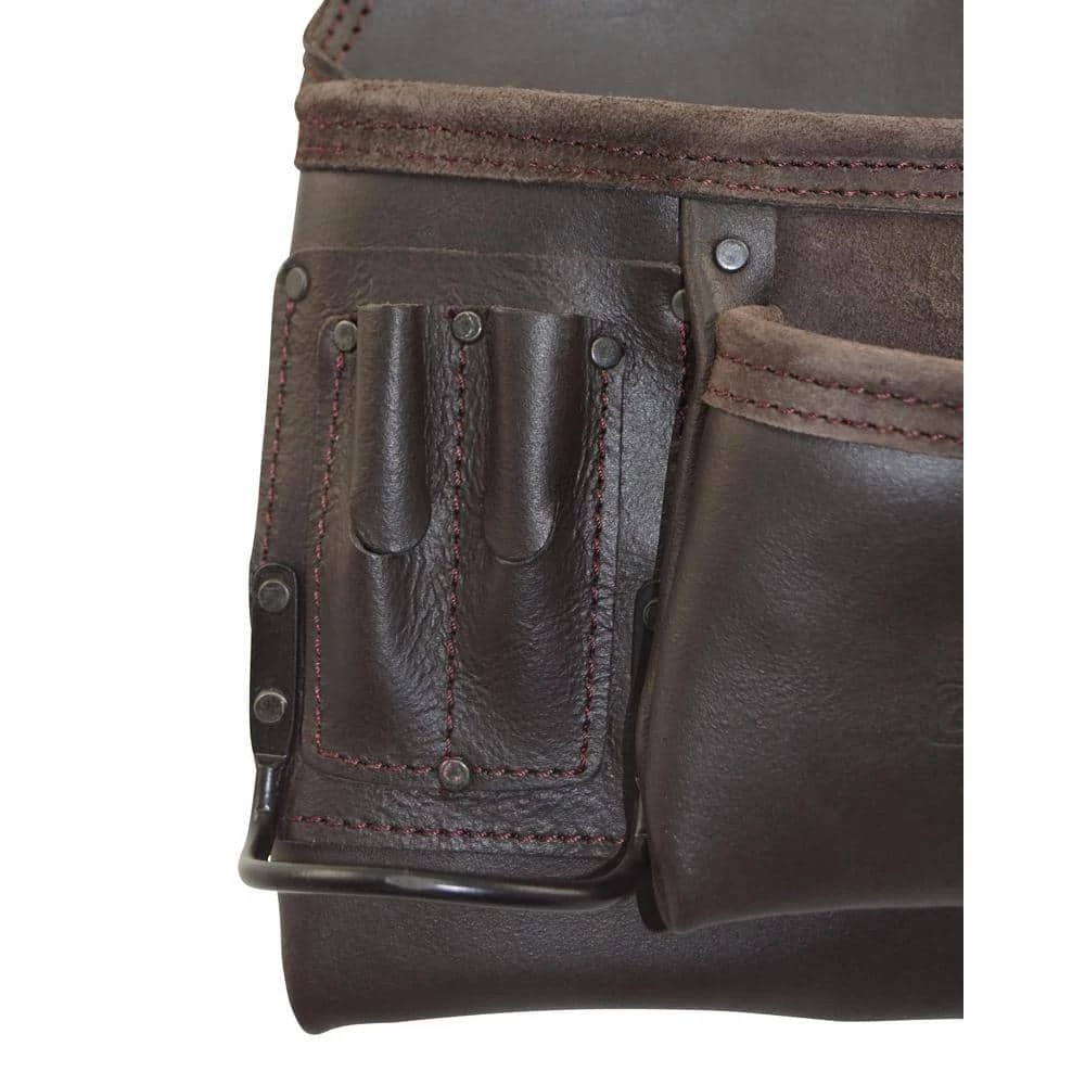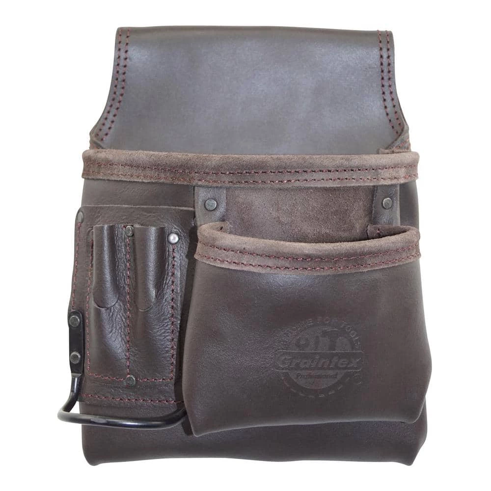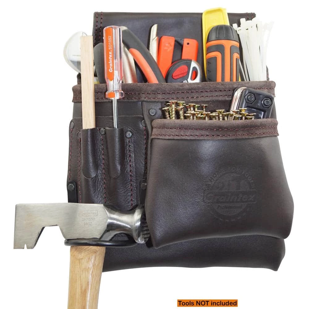 Graintex Inc. is proud to introduce a 5-Pocket Nail and Tool Pouch framed from heavy-duty Oil Tanned leather. Its designed for easy accessibility, extra durability and handy expandability. Contains 1 large, 1 medium, 3 small and 1 steel hammer holder fitting all standard hammers. Double stitched at all stress points reinforced with rivets and black plated hardware. Carries a 2-3/4 in. W belt tunnel slot.