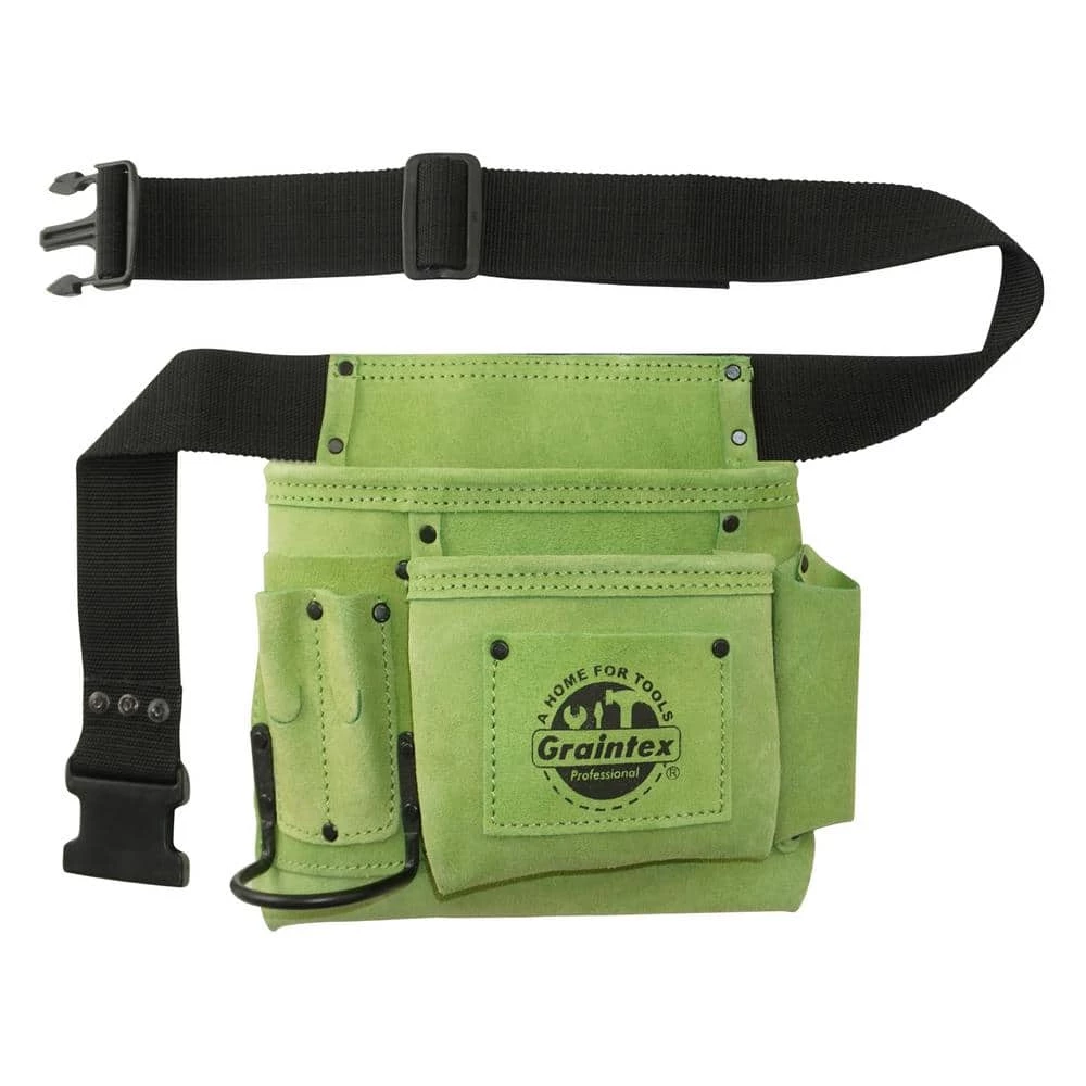 Graintex DISTINCTIVE PRODUCTS are handmade by our highly expert skilled craftsmen using top quality suede leather, giving our customer the satisfaction with our product that can last much longer. The 5 Pocket Nail and Tool Pouch in Lime Green color with 2 in. Belt constructed with heavy-duty genuine suede leather that is extra-soft and durable. Using the superior leather hides to prepare our exceptional line of suede series. This specific series is treated with the top-notch quality of chemicals and oils for extra-durability and strength. This exquisite tool pouch consists of 5 pockets for extra-convenience, the tool pouch comes with a 2 in. leather/web belt and can be adjusted as needed. Designed with 1 metal hammer holder following with 1 large pocket that can hold multiple tools. 1 medium front pocket that can fit nails, medium-sized tools, and 3 small pockets for screwdrivers, pens, pencils, utility knife, and other miniature sets. 1 additional small multi-purpose pocket front for small pencils, cards etc. The pockets are easily accessible, this tool pouch can be used in number of multiple other uses at the workplace or at home. With easily accessible pockets this tool pouch is a handy product for daily use.