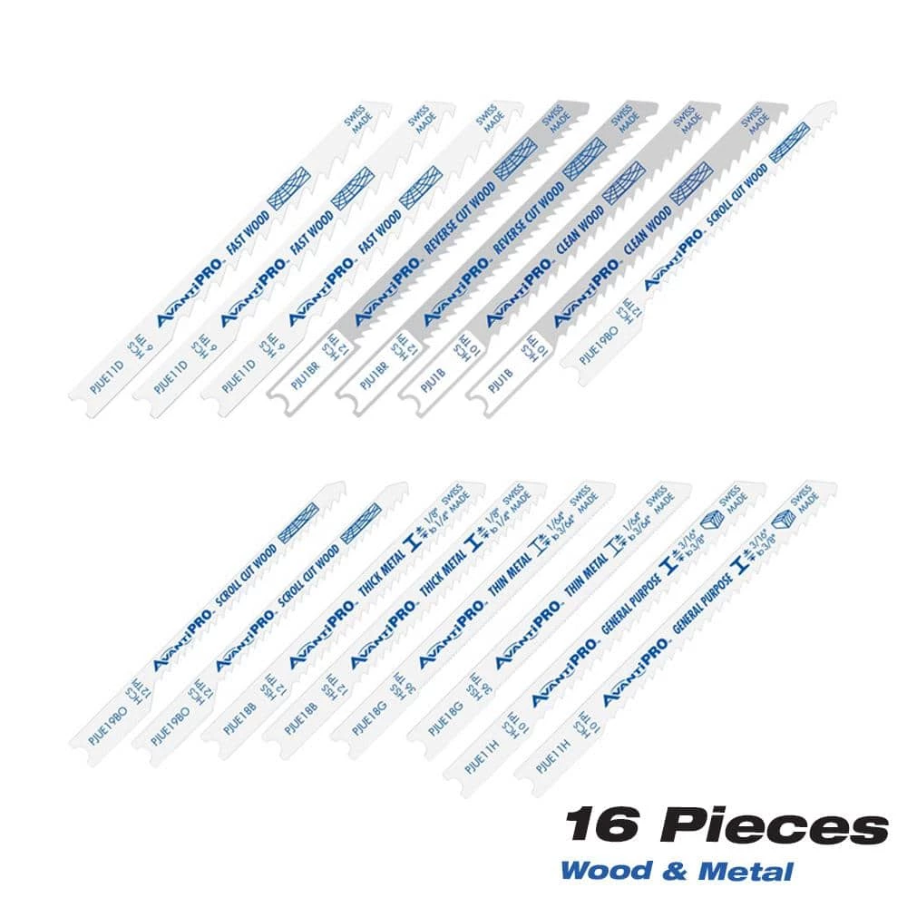 - Includes 16-piece jig saw blade set: three 6 TPI fast wood, two 10 TPI clean wood, two 12 TPI reverse cut wood, three 12 TPI scroll cut wood, two 12 TPI thick metal, two 36 TPI thin metal, two 10 TPI general purpose