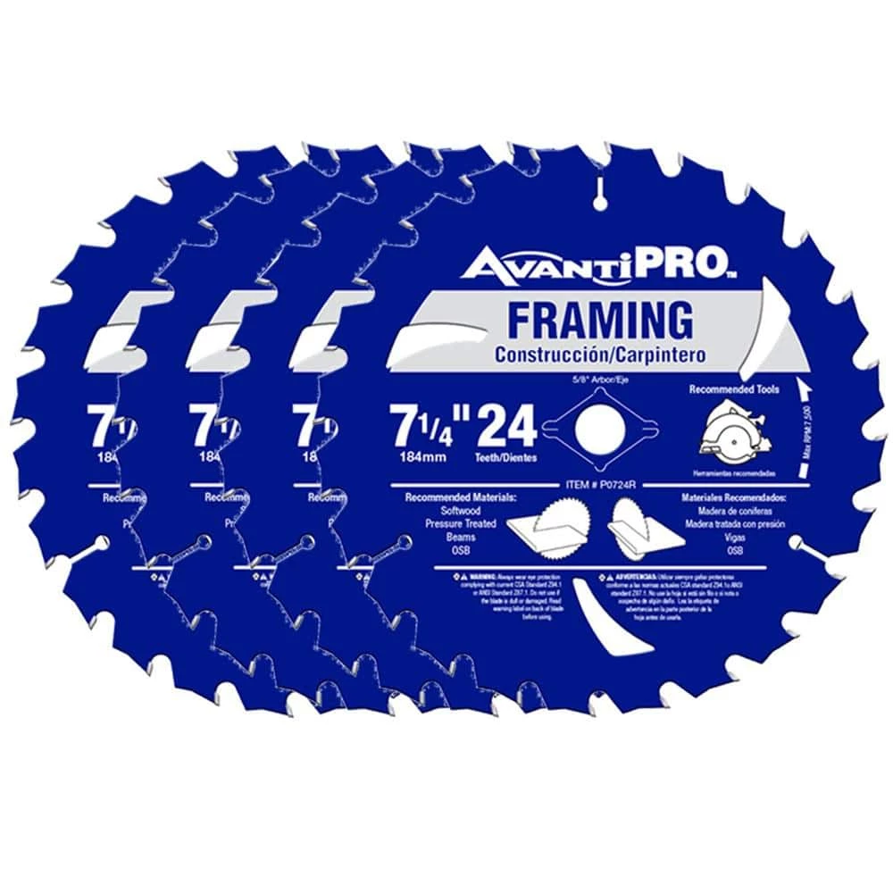 Avanti Pro 7-1/4 in. x 24-Tooth Framing Circular Saw Blades (4-Pack) are designed with a thin kerf and made of ultra-durable carbide for fast, clean cuts in a variety of materials including wood, plywood and fiberboard. They have a friction-reducing rim coating that protects the blade from drag and binding. Three expansion slots help each blade expand and contract during use, resulting in minimal vibration and straight cuts. Carbide-reinforced steel construction allows heavy-duty use and rugged applications.