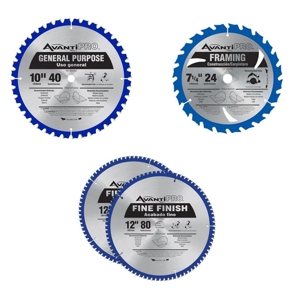 Avanti Pro Bundle features a 7-1/4 in. x 24-tooth Carbide Framing Saw Blade designed to cut MDF, soft wood and treated beams and can be used with your 7-1/4 in. corded or cordless circular saw. The 10 in. x 40-tooth General Purpose Saw Blade is designed for professional contractors. It produces clean cuts in wood materials and pressure-treated plywood beams. The 12 in. x 80-tooth Fine Finish Saw Blades are made of carbide for durability.