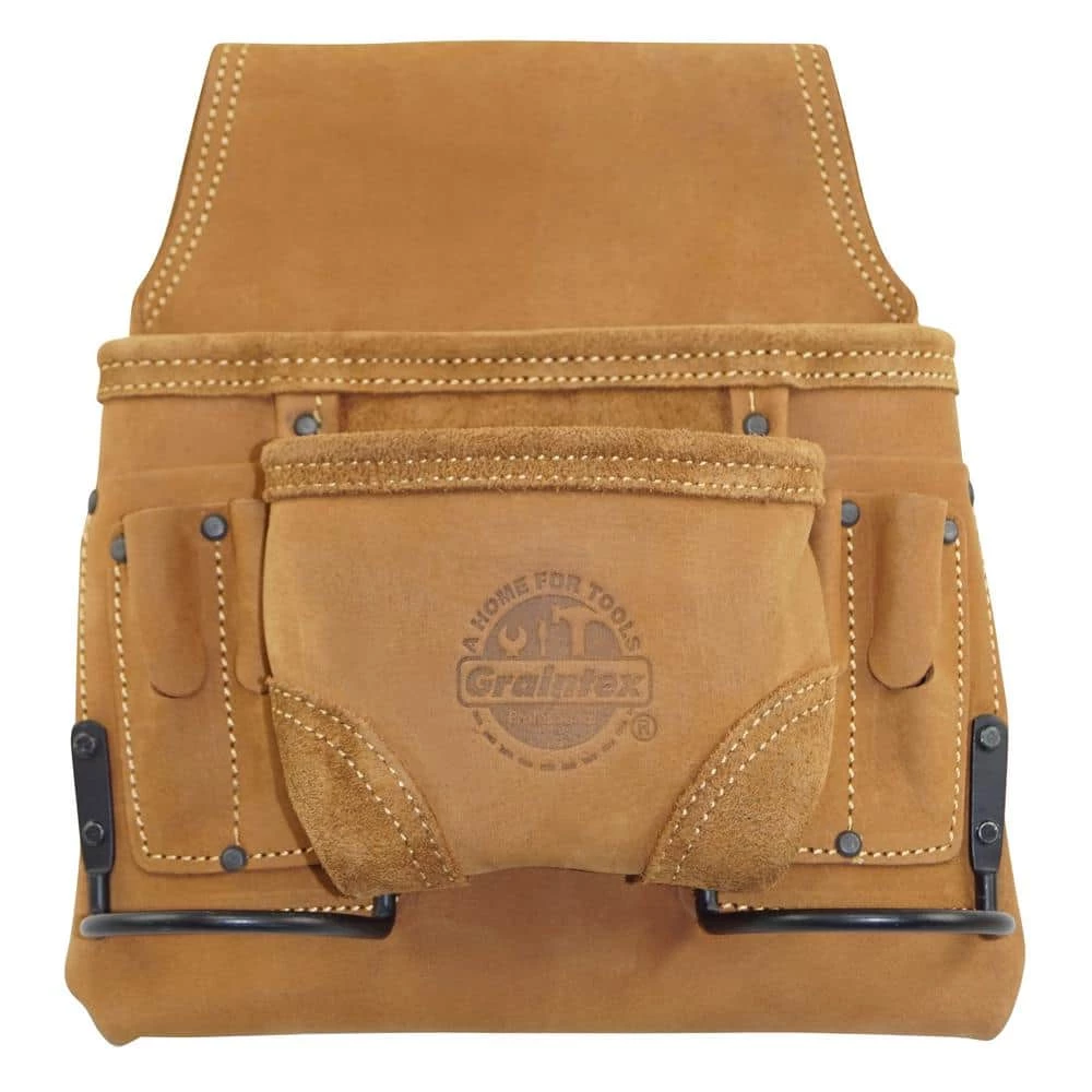 Graintex Inc. is proud to introduce an 8-Pocket Nail and Tool Pouch framed with Oil Tanned leather. Its designed for easy accessibility, extra-durability and handy expandability. Contains 1 large, 1 medium, 6 small pockets for small to hand tools and 2 metal hammer holders fitting all standard sized hammers. Double stitched at all stress points reinforced with rivets and black plated hardware. Carries a belt tunnel slot that can fit a 2-3/4 in. W belt.