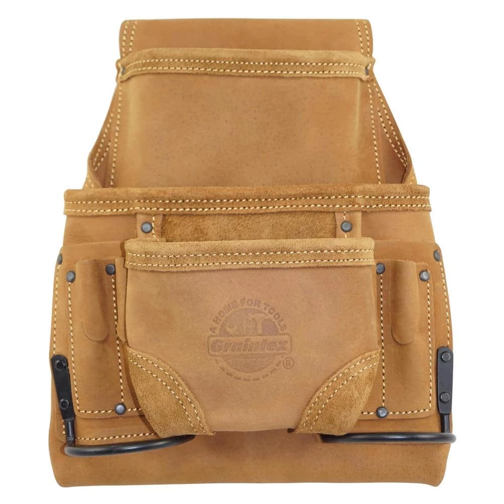 Graintex Inc. is proud to introduce a 9-Pocket Nail and Tool Pouch framed with Oil Tanned leather. Its designed for easy accessibility, extra-durability and handy expandability. Contains 1 large, 1 medium, 6 small pockets for small to hand tools, 1 belt level inner pockets and 2 metal hammer holders fitting all standard sized hammers. Double stitched at all stress points reinforced with rivets and black plated hardware. Carries a belt tunnel slot that can fit a 2-3/4 in. W belt.
