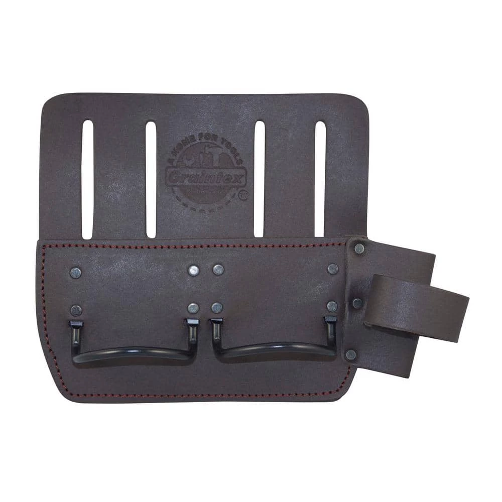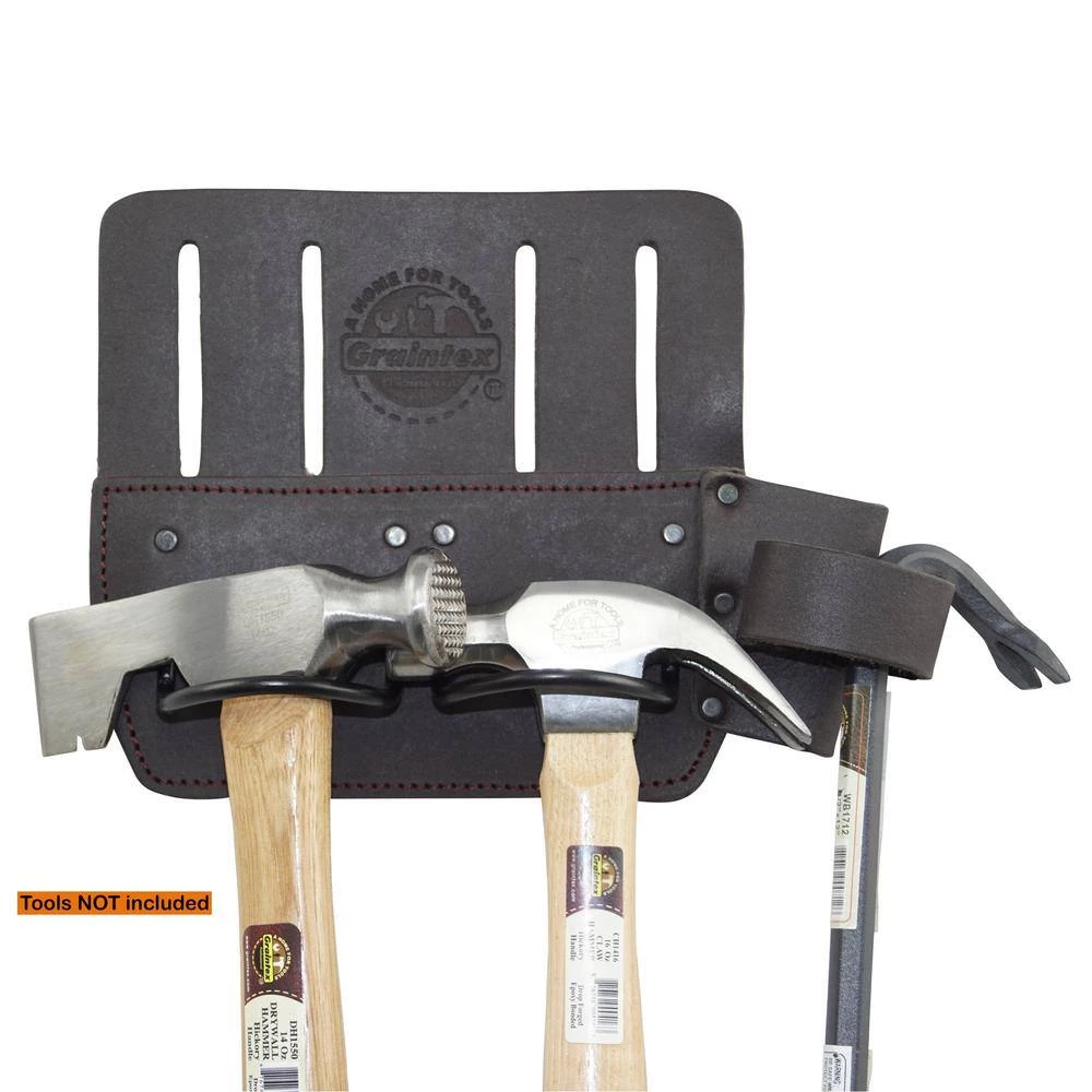 Graintex Inc. is proud to introduce a Multi-Tool Hammer Holder with belt framed from heavy-duty Oil Tanned leather. Its designed for easy accessibility, extra durability and handy expandability. Contains 2 hammer holders, 1 utility knife holder and 1 pry bar holder fitting all standard sized. Double stitched at all stress points reinforced with rivets and black plated hardware. Carries a 2-3/4 in. W belt tunnel slot.