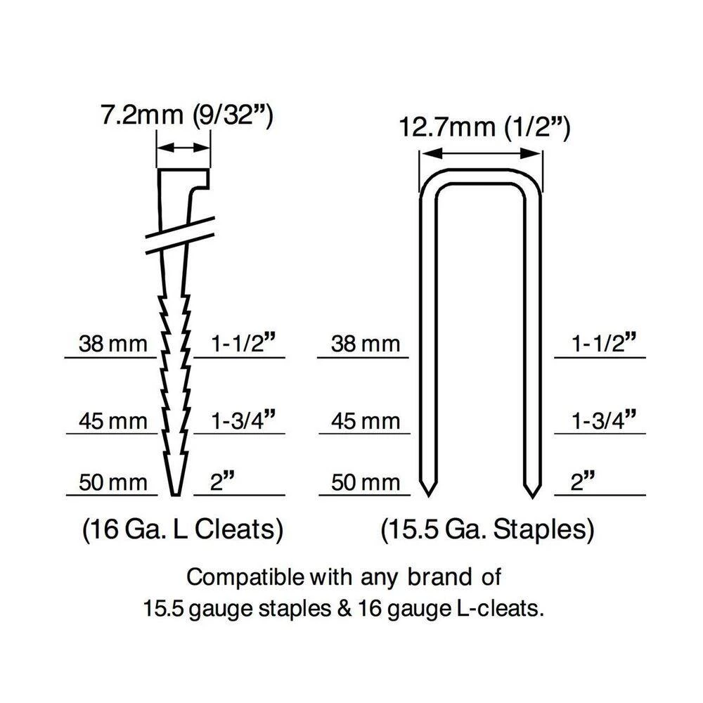 - Compatible with 16-gauge glue collated L-cleats and 15.5-gauge glue collated 1/2 in. crown staples from 1-1/2 in. to 2 in. for both types of fasteners