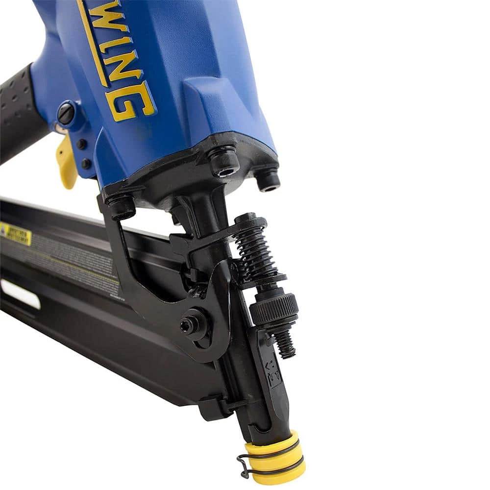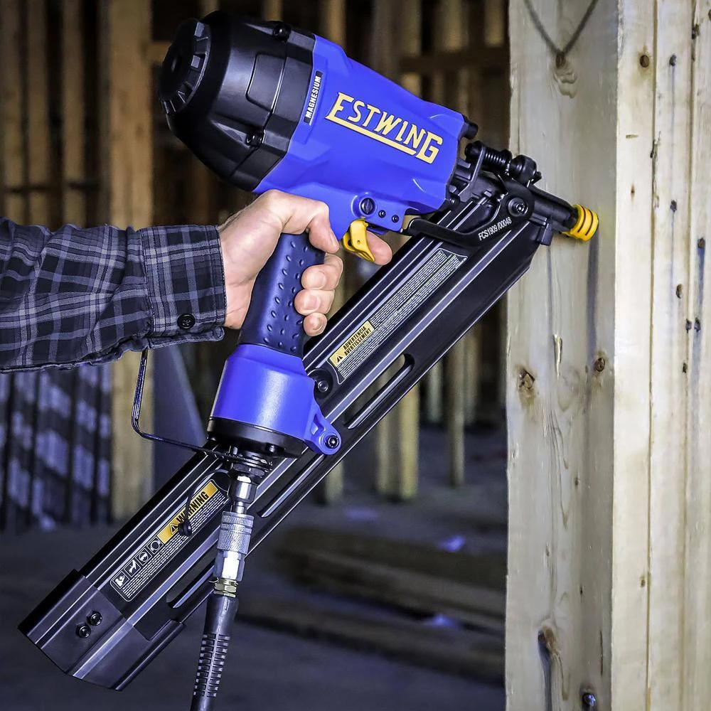 The Estwing EFR3490 Pneumatic 34 Degree 3-1/2 in. Clipped Head Framing Nailer with Bag is the ideal tool for framing, decking, and fencing jobs. This air powered nail gun features a strong, lightweight magnesium body, a one-piece hardened steel drive blade, and rubber O-rings. A no mar tip protects your work surface from damage, but you can take it off to reveal teeth that grip onto lumber for a secure, no-slip hold when firing. The tool-free finger depth adjust provides a wide variety of options for driving depth. The 1/4 in. NPT industrial swivel fitting rotates 360 degrees for maximum accessibility in tight spots. Hang your nailer up with the integrated rafter hook when you need to free up an extra hand. You can quickly switch from bump to single fire using the select fire trigger. An anti-dry-fire mechanism protects the internal parts by stopping any firing when there are only a few nails remaining. This nailer is compatible with 34 degree paper collated clipped head framing nails from 2 in. to 3-1/2 in. (.113 in. – .131 in. shank). This durable framing nailer is suitable for any professional construction contractor at the jobsite or DIYer at home, and is high-performing in both indoor and outdoor applications. The Pneumatic 34 Degree 3-1/2? Clipped Head Framing Nailer with Bag is part of Estwing’s professional line of pneumatic tools, and is covered by a 5 Year Professional Tool Warranty and 90 Day Wearable Parts Warranty.